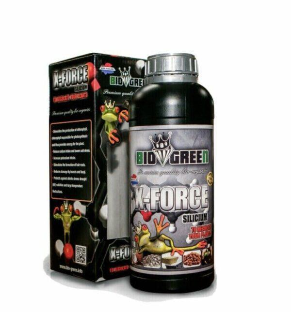 Introducing the Bio Green 1 Litre X Force, a high-quality concentrate solution made in the Netherlands. This powerful liquid additive contains a mineral-based material basis and features Silcon as its key ingredient.